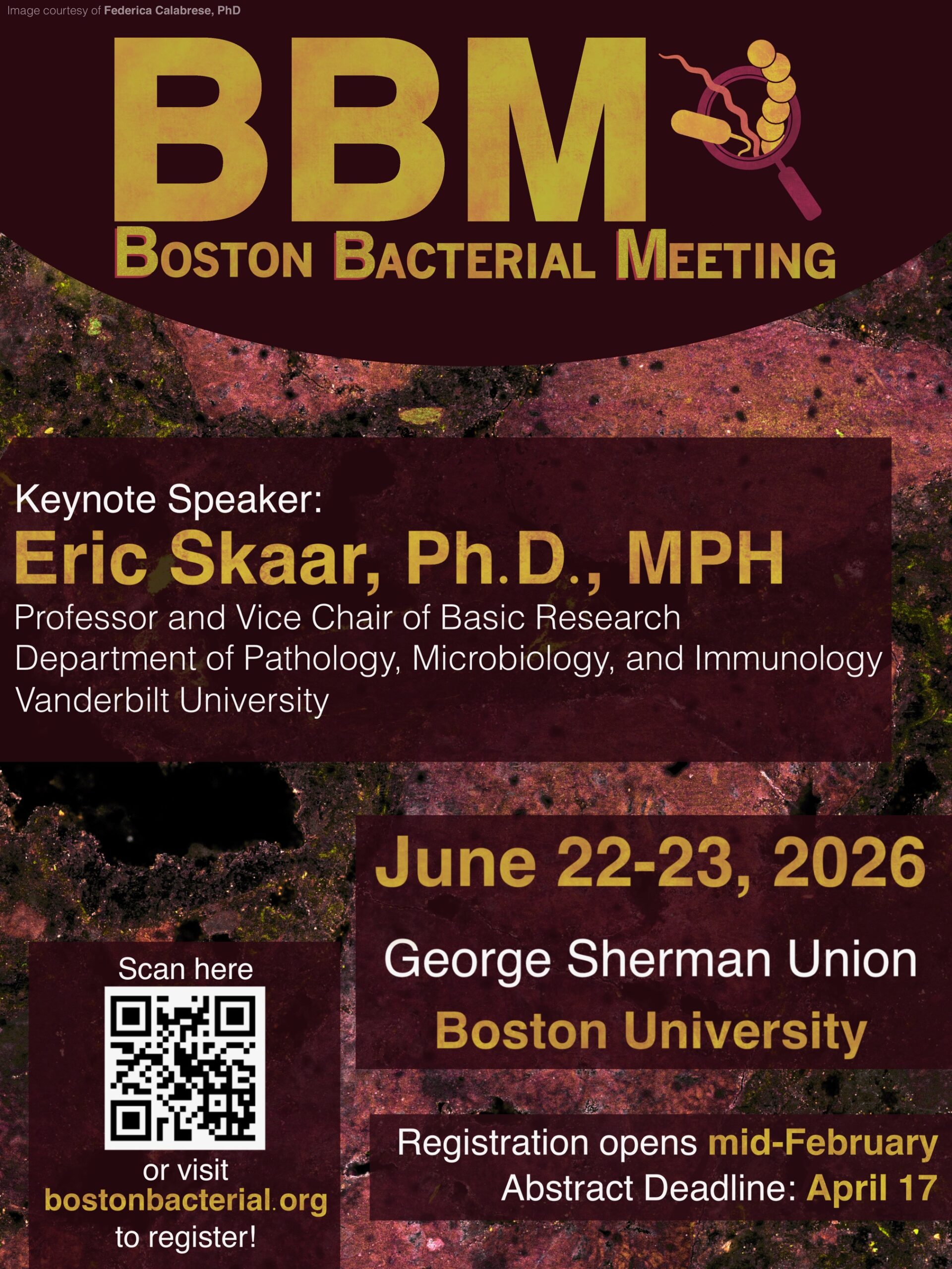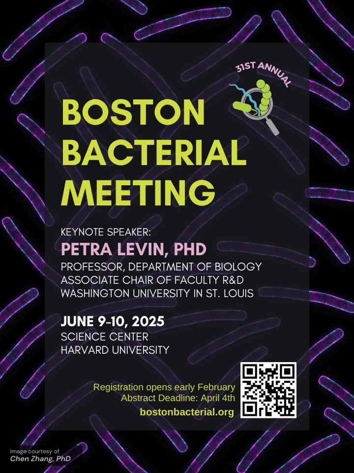 The micrograph featured on the BBM posterwas taken by Andrea Vettiger back when he was a postdoc in Tom Bernhardt’s lab at Harvard Medical School; he is currently an Assistant Professor at the University of Lausanne. The image shows a composite of the outer membrane protein Pal (magenta) and bacterial cytoskeletal element MreB (white) in Escherichia coli. The image was acquired using a combination of structured illumination and total internal reflection microscopy. MreB displacement was analyzed by TrackMate (colors).